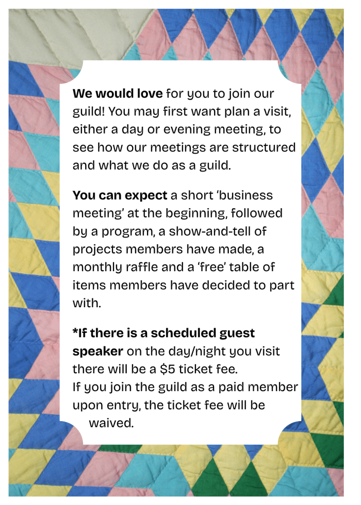 Please send us a message (info provided on the CONTACT page) and include your email address to request a form; fill it out and bring it to a Guild meeting along with a check payable to the “Quilters by the Sea Guild.” Turn it in at the Membership Table and receive your membership card.